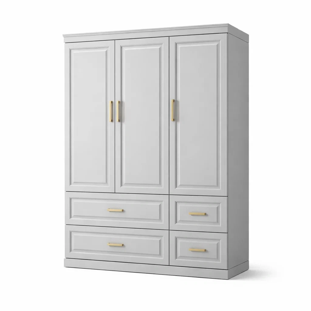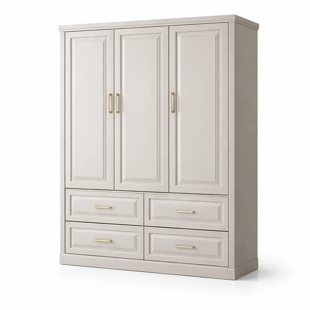 Armoire en bois MDF beige avec 3 portes et 4 tiroirs