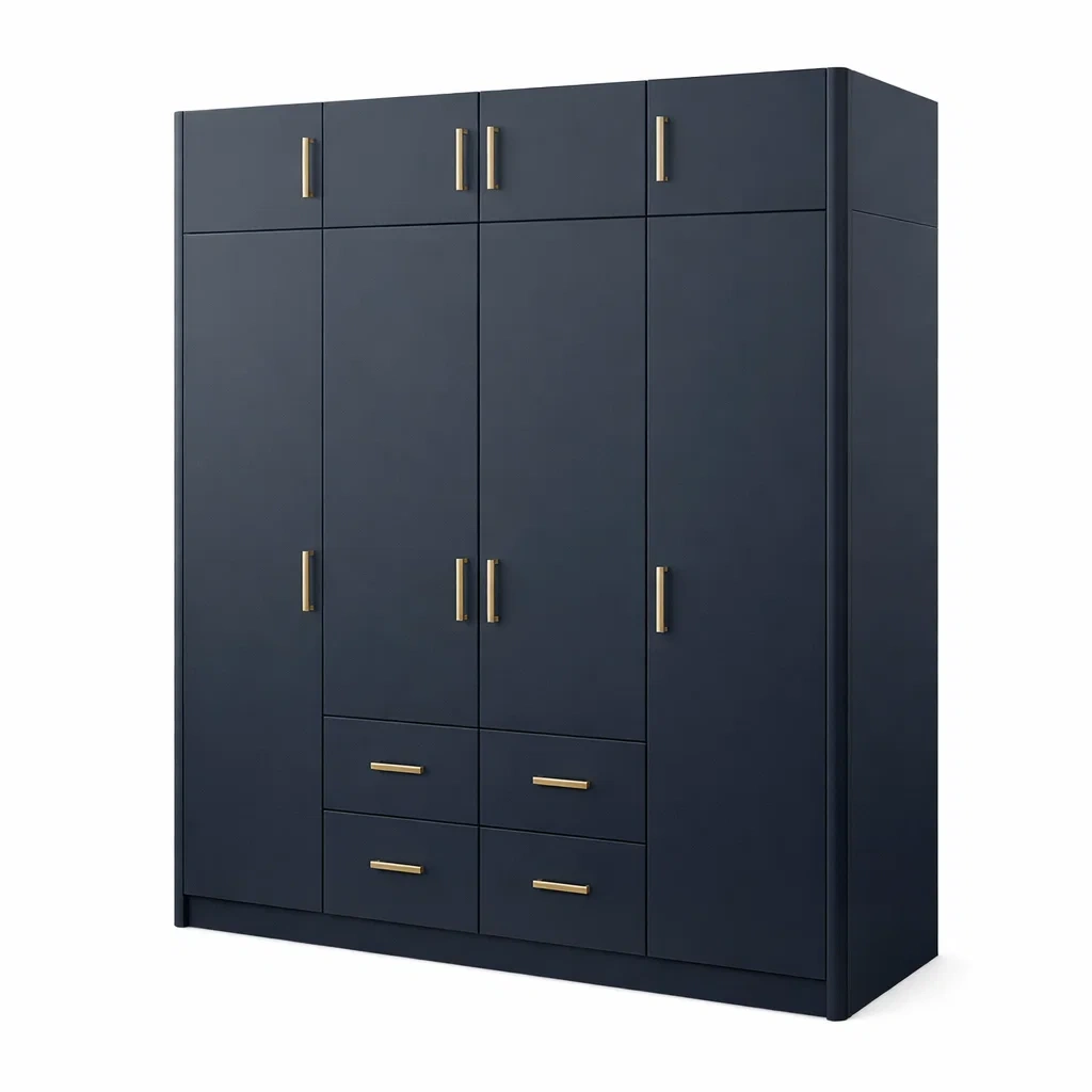 Armoire en bois avec poignées en métal bleu foncé