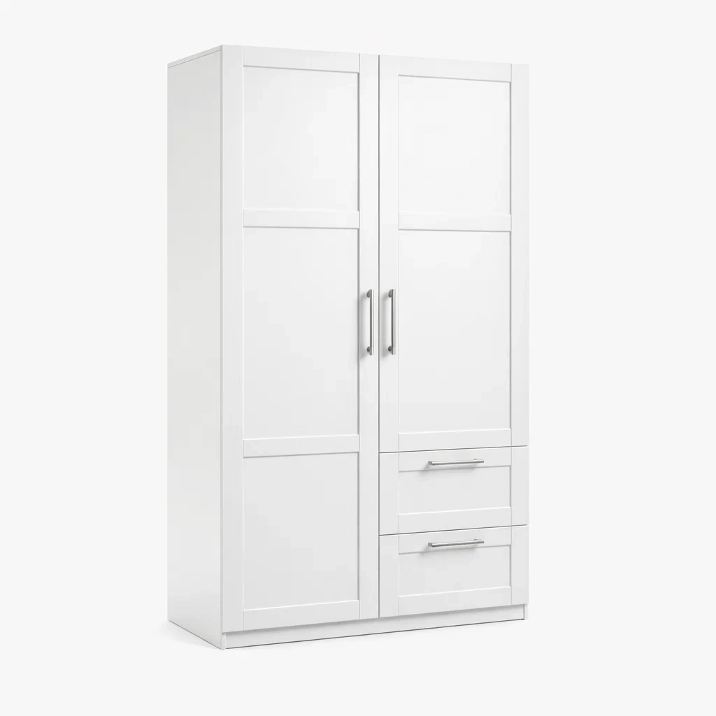 Armoire en bois blanche avec 2 portes et 2 tiroirs et poignées en métal