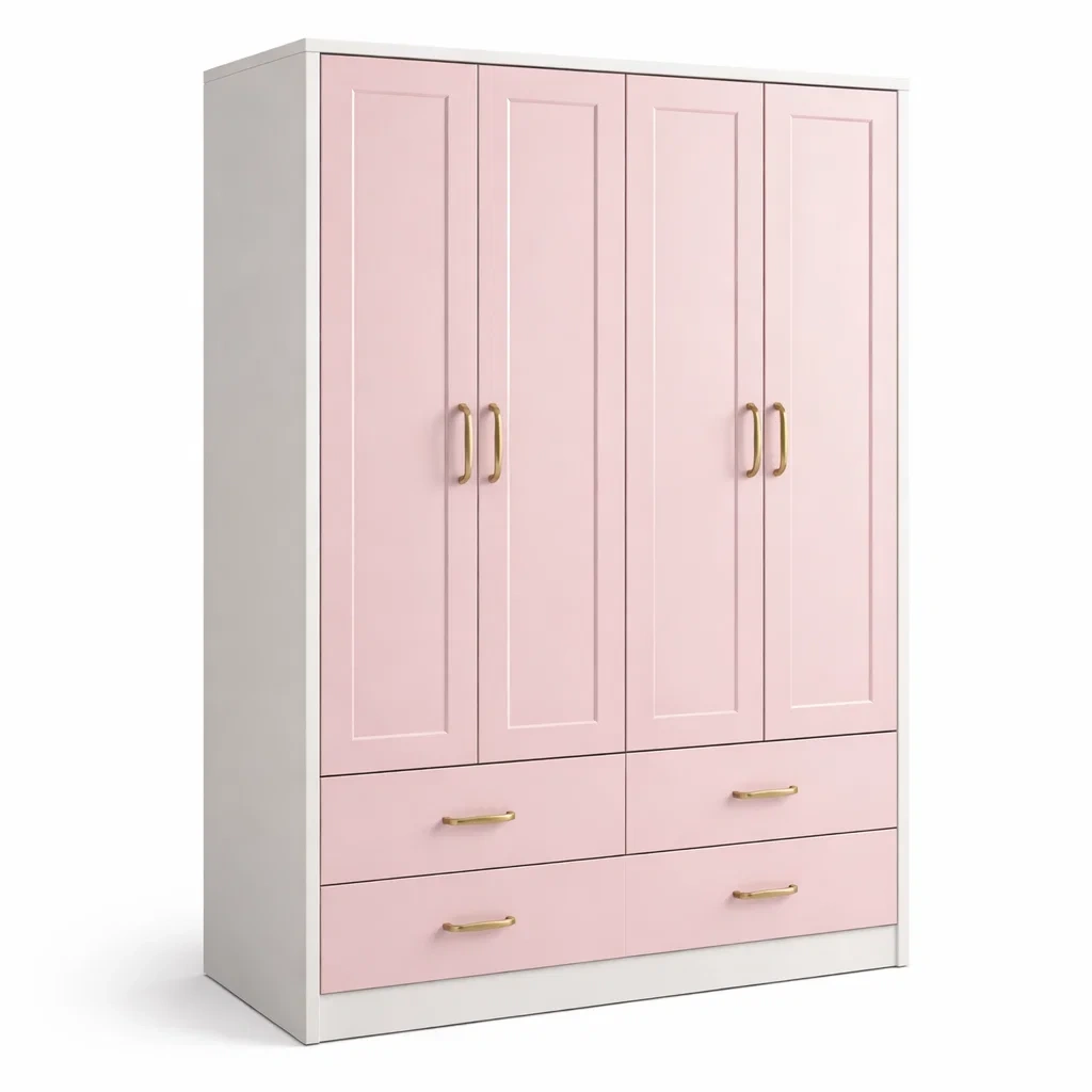 Armoire en bois rose et blanc avec 4 portes et 2 tiroirs