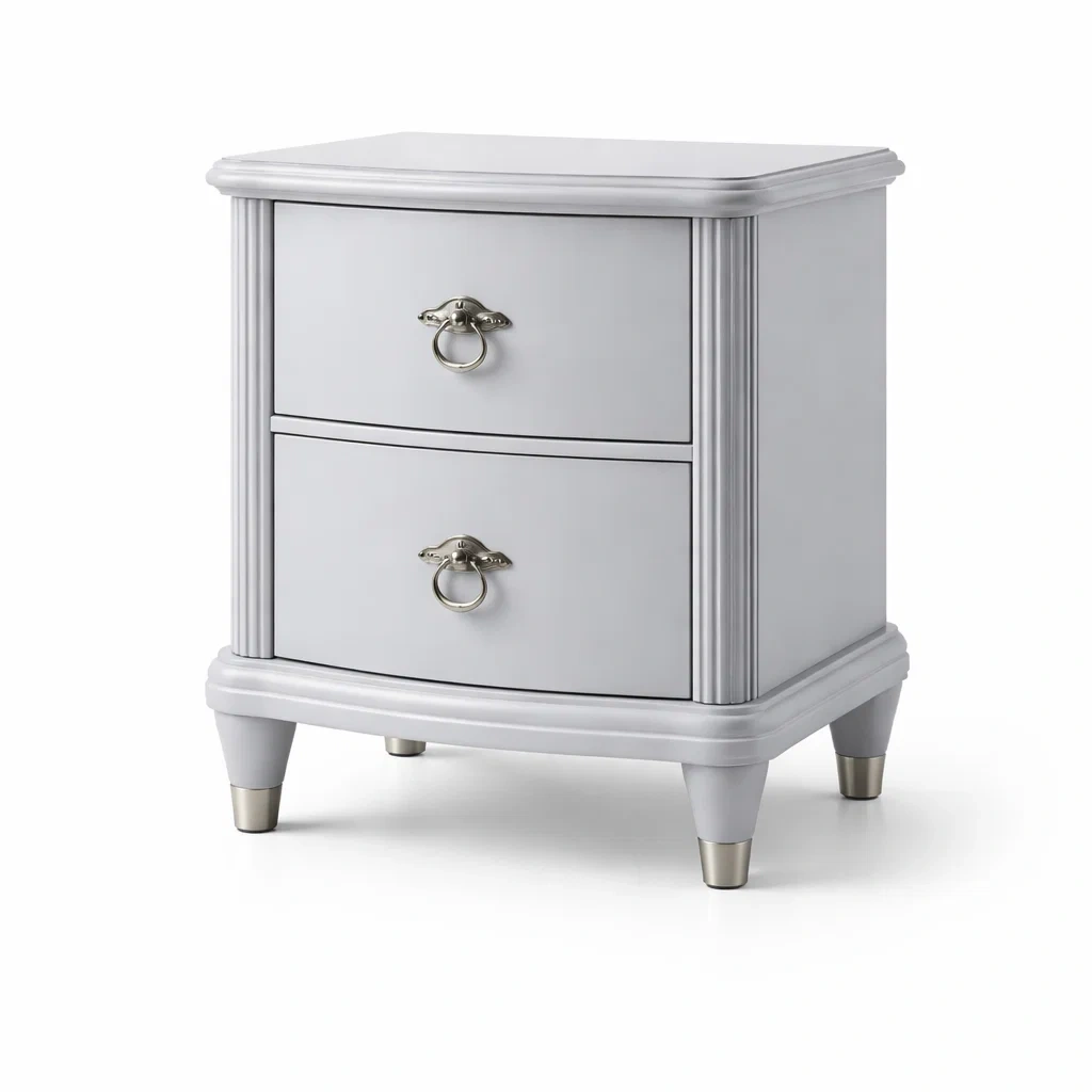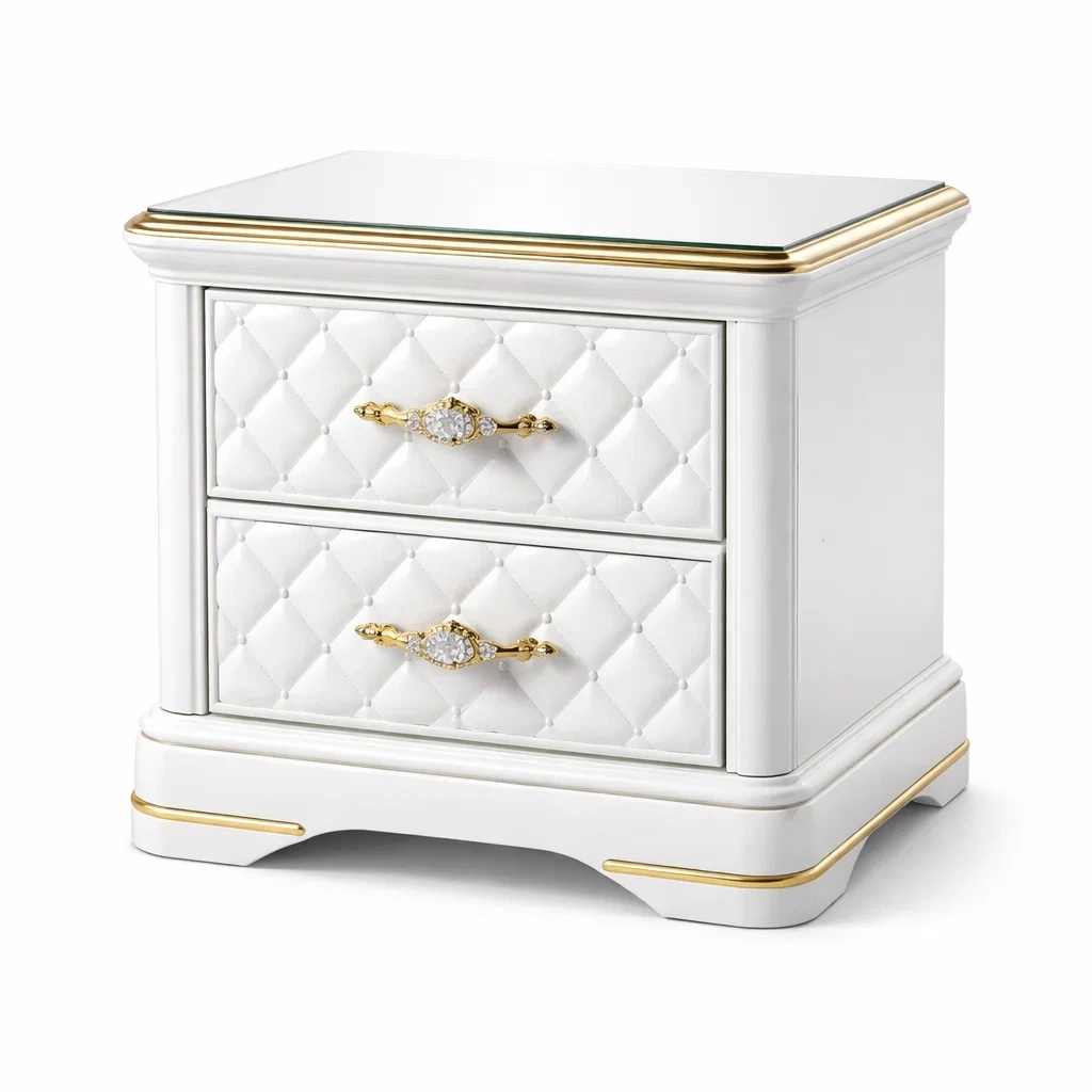 Table de chevet en bois MDF avec similicuir blanc et ornements en métal