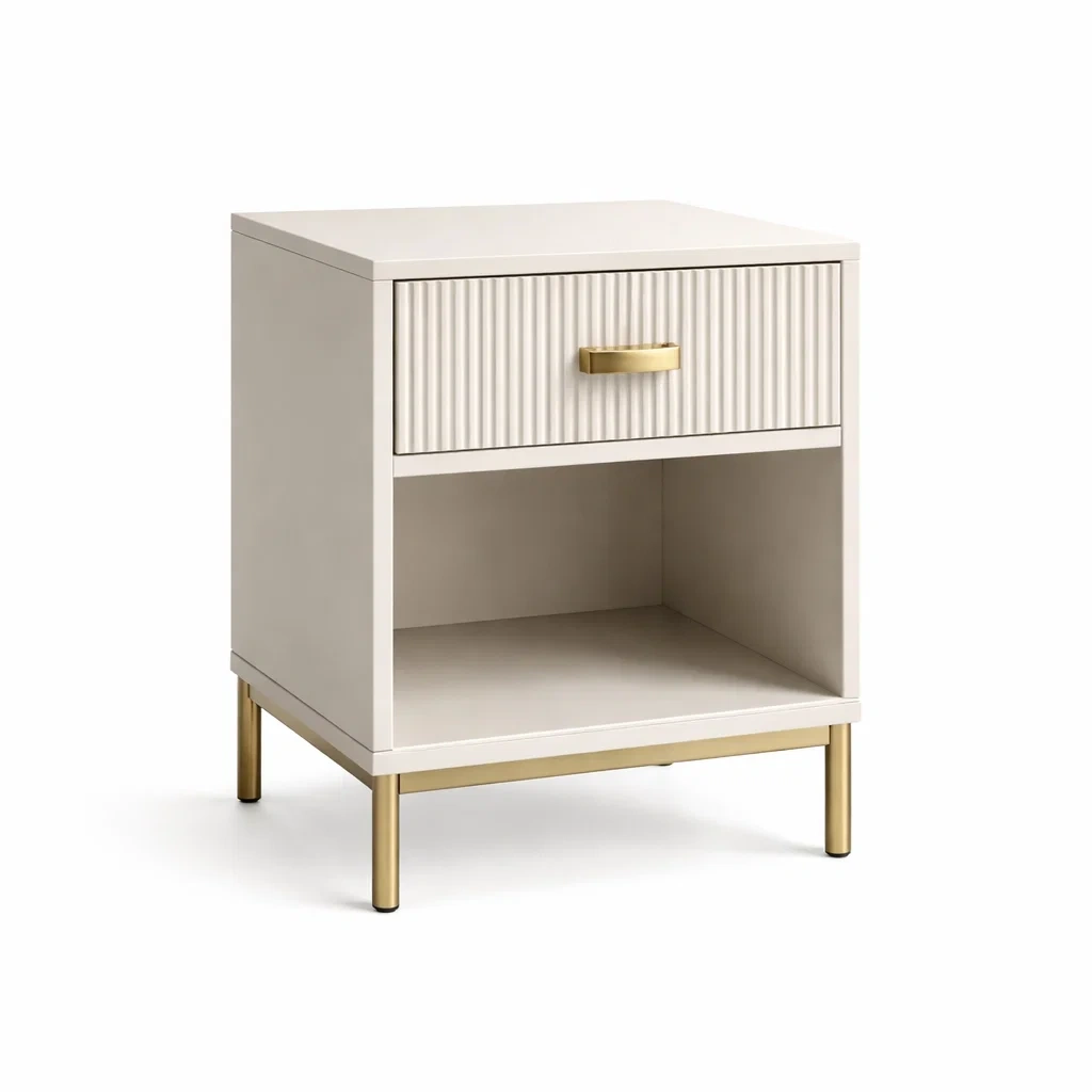 Table de chevet en MDF avec tiroir nervuré et pieds métalliques dorés