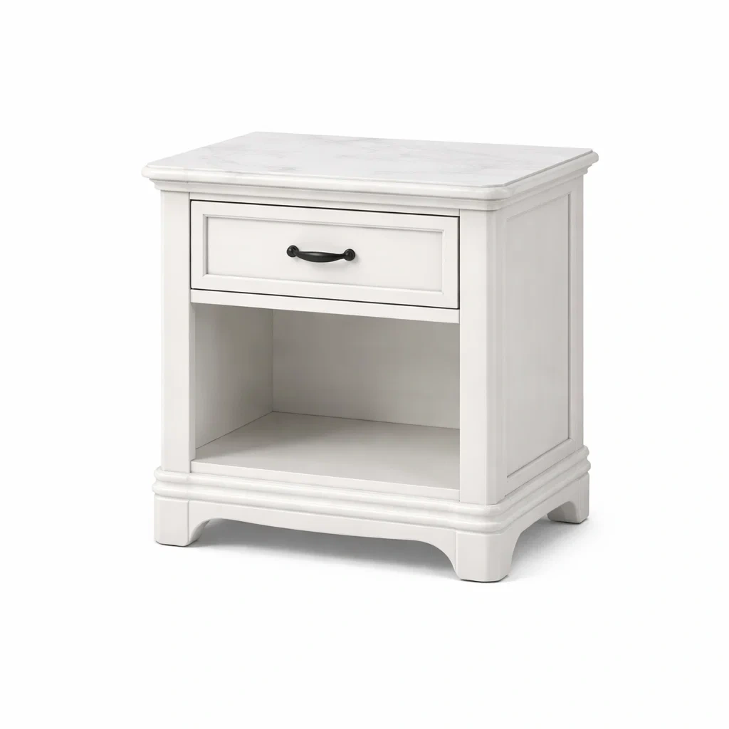 Table de chevet en bois blanc avec tiroir et étagère