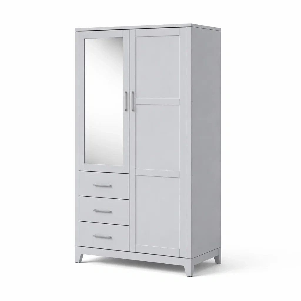 Cette armoire est fabriquée en panneau de fibres de moyenne densité (MDF) et est de couleur grise. Elle dispose de deux portes, dont une avec un miroir en verre argenté, et de trois tiroirs pour le rangement. Avec des dimensions de 180 cm de hauteur, 90 cm de largeur et 50 cm de profondeur, elle offre un espace pour organiser vos vêtements et accessoires.