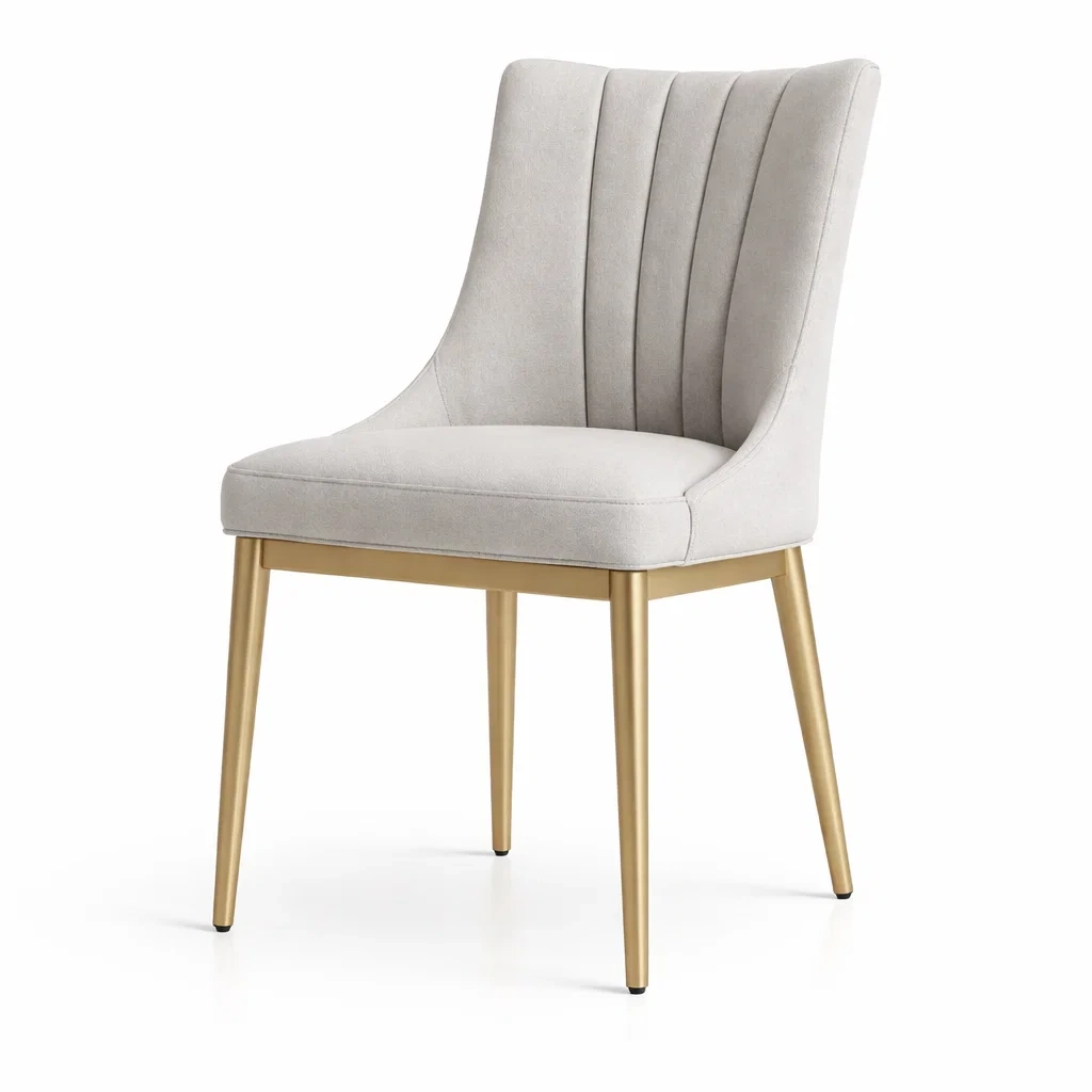 Chaise avec revêtement en tissu polyester gris et pieds en métal doré. Dimensions : 85 cm de hauteur, 45 cm de largeur, 50 cm de profondeur.