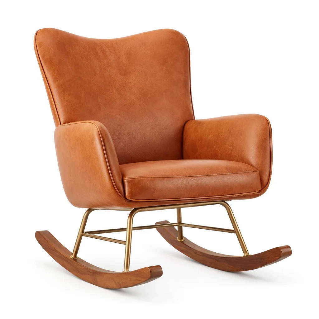 Fauteuil à bascule avec une assise en cuir synthétique de couleur marron. La structure est en métal avec des pieds à bascule en bois massif. Dimensions : 65 cm de longueur, 85 cm de largeur et 75 cm de hauteur. Poids total de 12.5 kg.