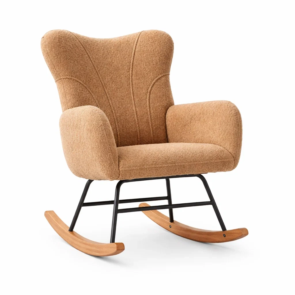 Fauteuil à bascule en tissu bouclé avec cadre en métal et bois