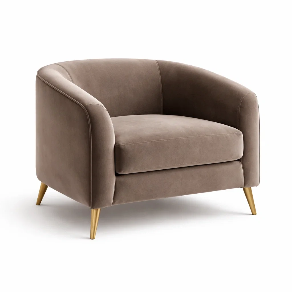Fauteuil en tissu marron avec pieds en métal doré
